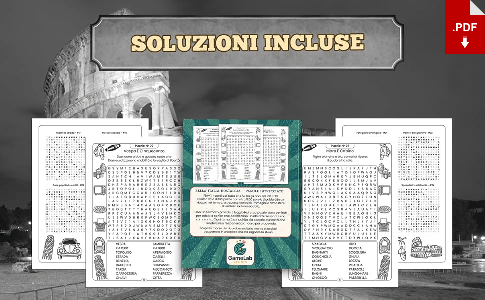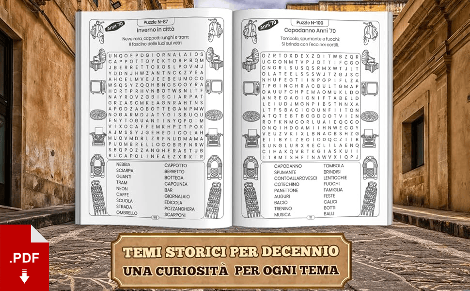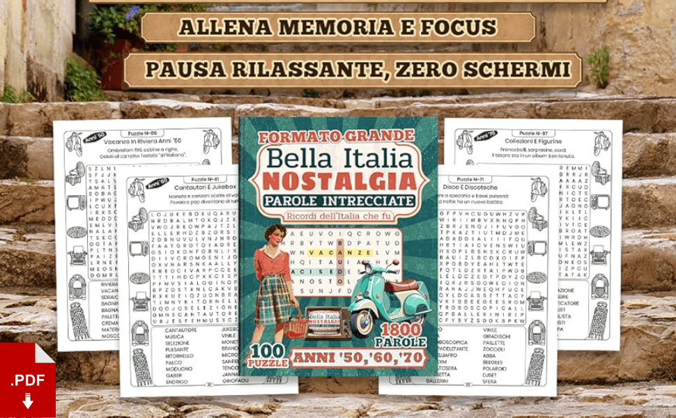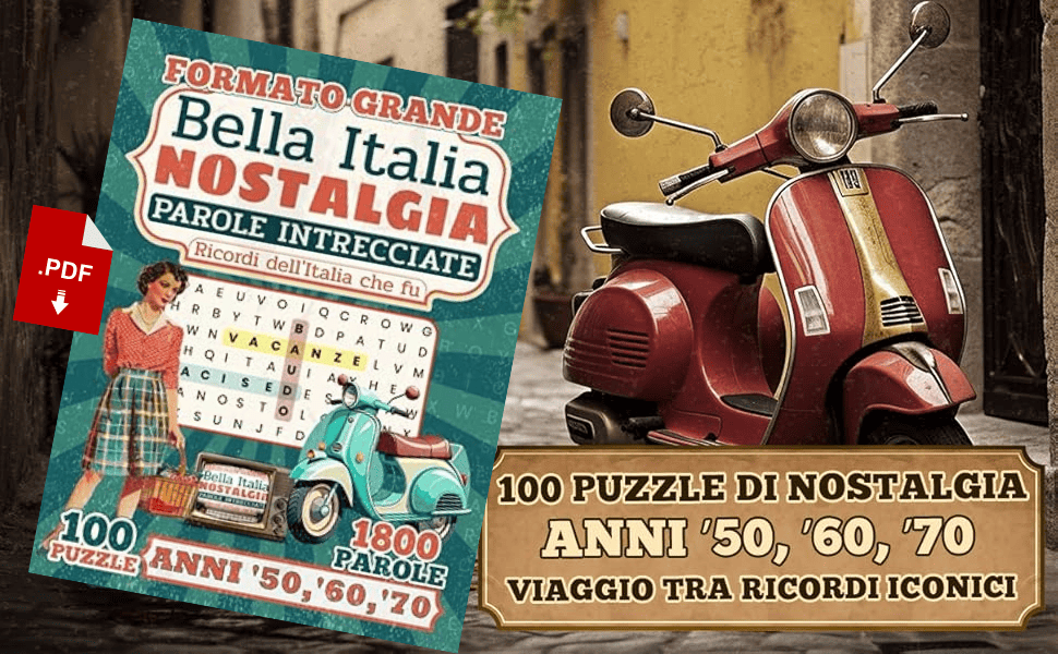 Táto zbierka osemsmeroviek ti pomôže precvičiť si talianske slovíčka a pritom spoznať atmosféru minulých desaťročí: čiernobiele televízory, letá pri mori, speváci, Vespa, Fiat 500 i malé kaviarne na rohu.